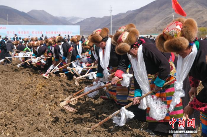 3月16日,推萨市直火县达嘎镇色达村村平易近参与秋耕典礼。中新社记者 江飞波 摄 秋耕典礼借正在持续,村里的男士正在1块田间轮番扔石挨牛角,喝采声此起彼伏;密斯则一壁唱着休息歌直,一壁脚持木耙标志性天平坦地盘,歌声招展正在创新的田垄间。(完)